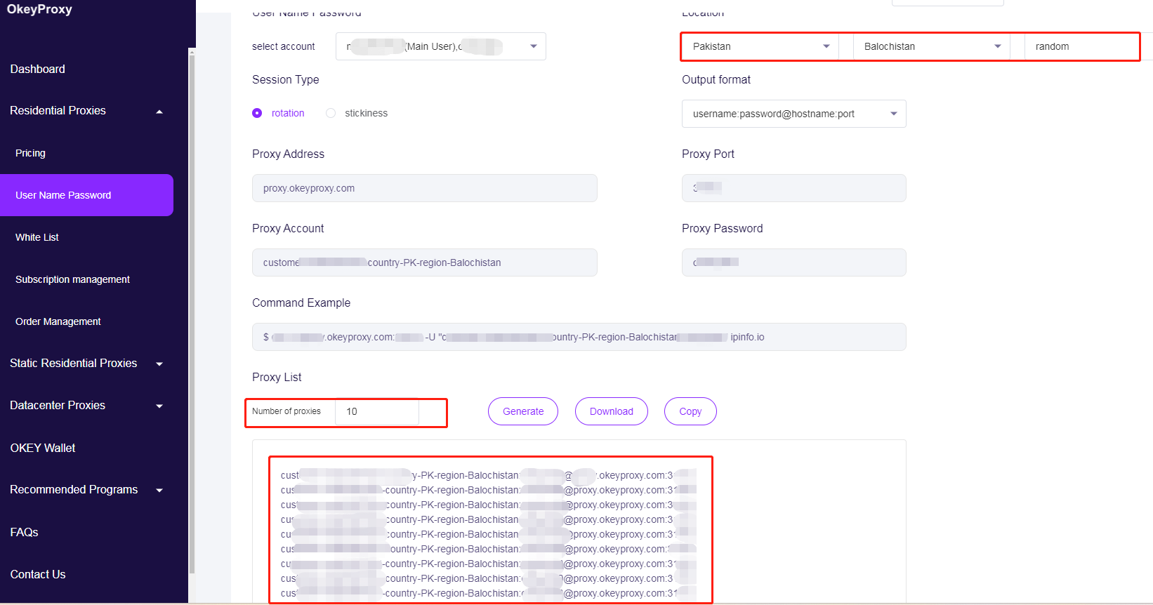 After generating proxies, OkeyProxy will provide proxy strings like: