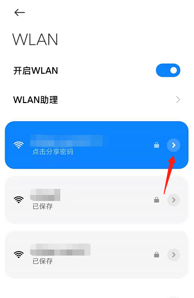 2、选择已连接的WIFI网络,点小箭头进入设置页面。