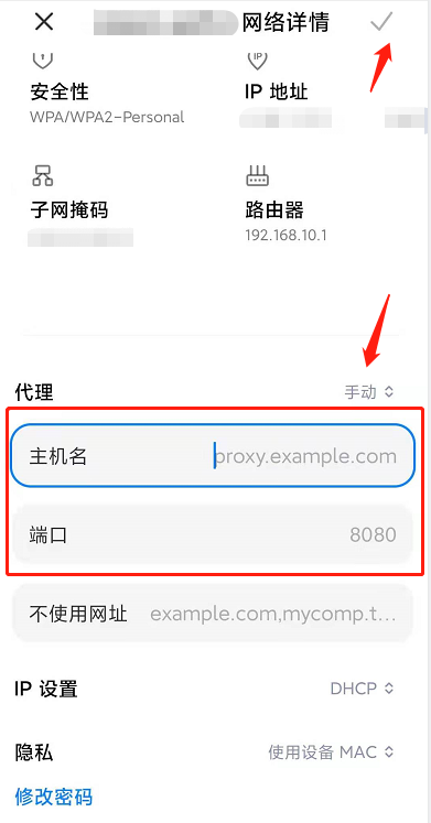 3、将代理设置为“手动”,填写主机名,端口信息,点击右上角保存。