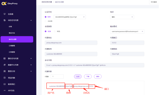 访问OkeyProxy官网,进入仪表盘,点击【动态住宅代理】-【端点生成器】。