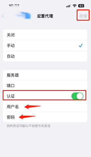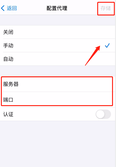 4、填写服务器、端口,点击右上角存储。