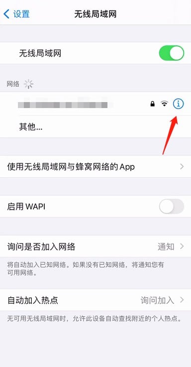 2、找到已连接的wifi,点击右侧的小图标。