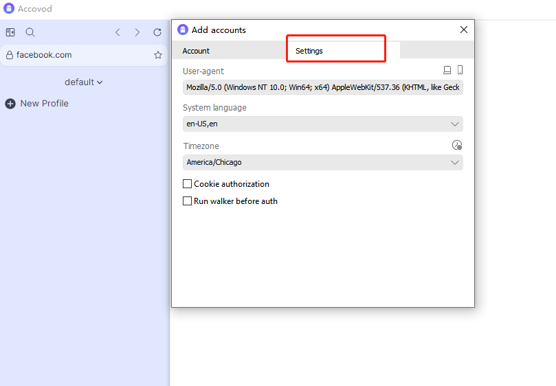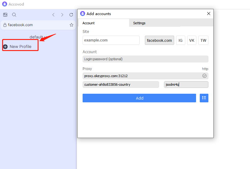 4.下载并安装Accovod:访问Accovod网站,下载并安装浏览器。5.在 Accovod 中创建新配置文件:打开 Accovod 并单击位于左框架顶部的“新建配置文件”按钮。 将出现一个新窗口。