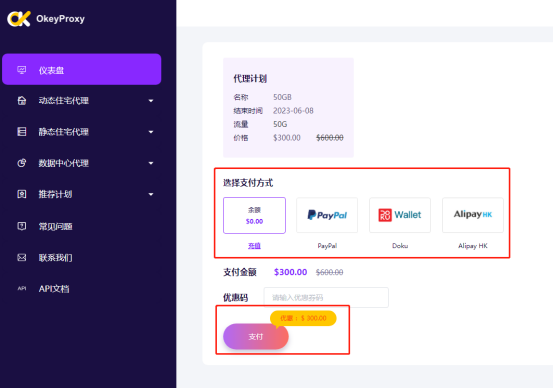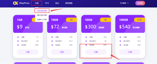 1、打开OkeyProxy官网,注册账号并登陆后点击【代理】、【动态住宅代理】。选择适合您的套餐进行订购。