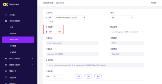 5、选择会话类型:轮换(一次一换,每次请求都更换一次IP地址)和粘性(连接代理IP设置的会话会保持一定的时间段,最长30分钟会话时间)。
