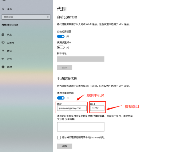 8、打开电脑【设置】-【代理】-【手动设置代理】,输入IP地址和端口并保存。