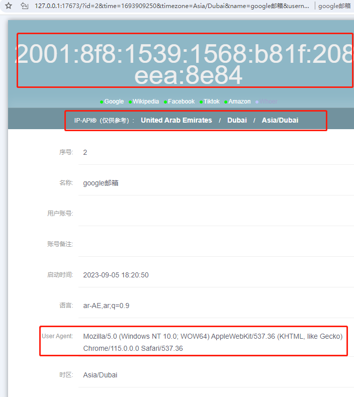 4. 最后, 我们可以在浏览器打开页面上获取到代理和浏览器信息, 比如来自阿拉伯迪拜的IP地址, 以及 UA信息: [Mozilla/5.0 (Windows NT 10.0; Win64; x64) AppleWebKit/537.36 (KHTML, like Gecko) Chrome/113.0.0.0 Safari/537.36.]