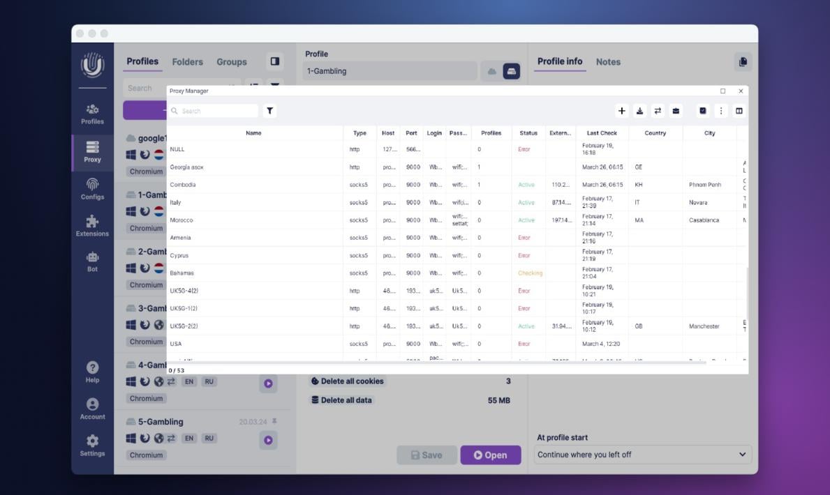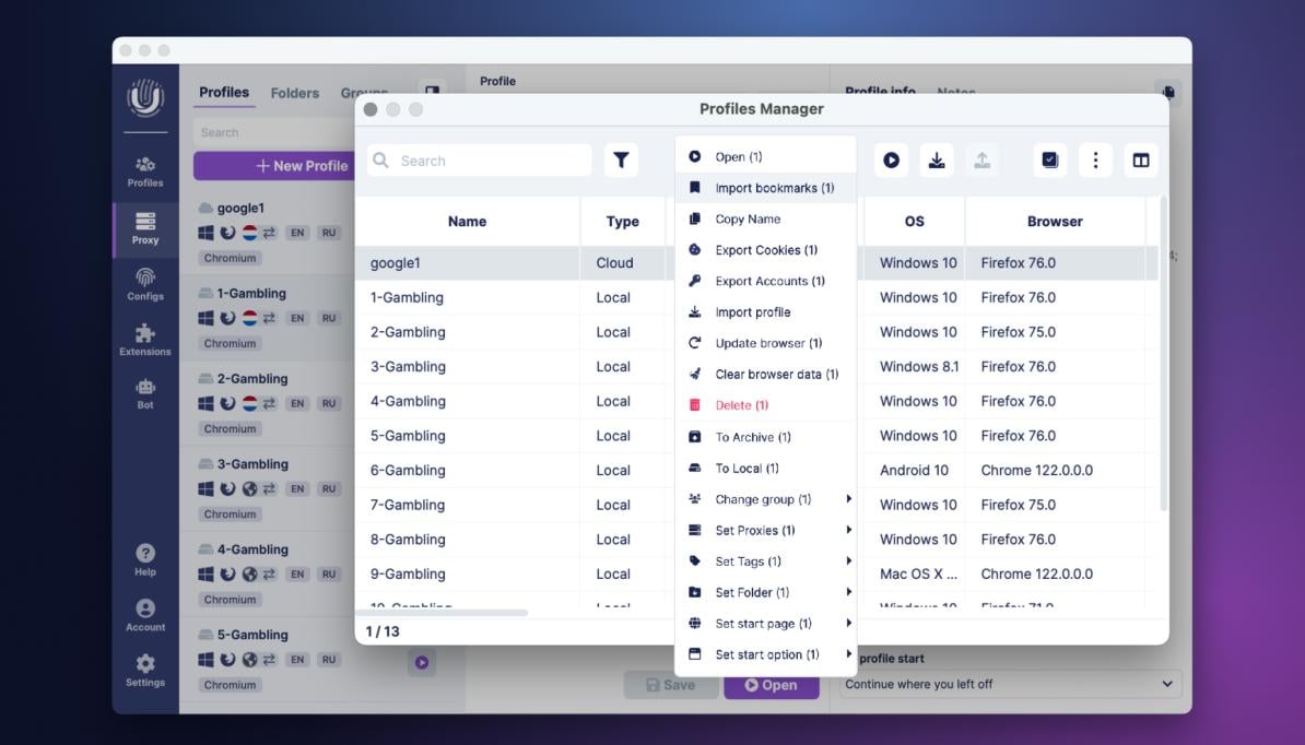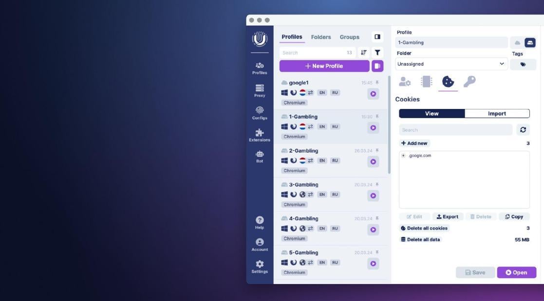 只需单击几下,您就可以使用用户代理、Cookie 或通用格式(名称、Cookie、代理类型、代理、用户代理、注释)的配置或列表来创建数百个独特的配置文件。