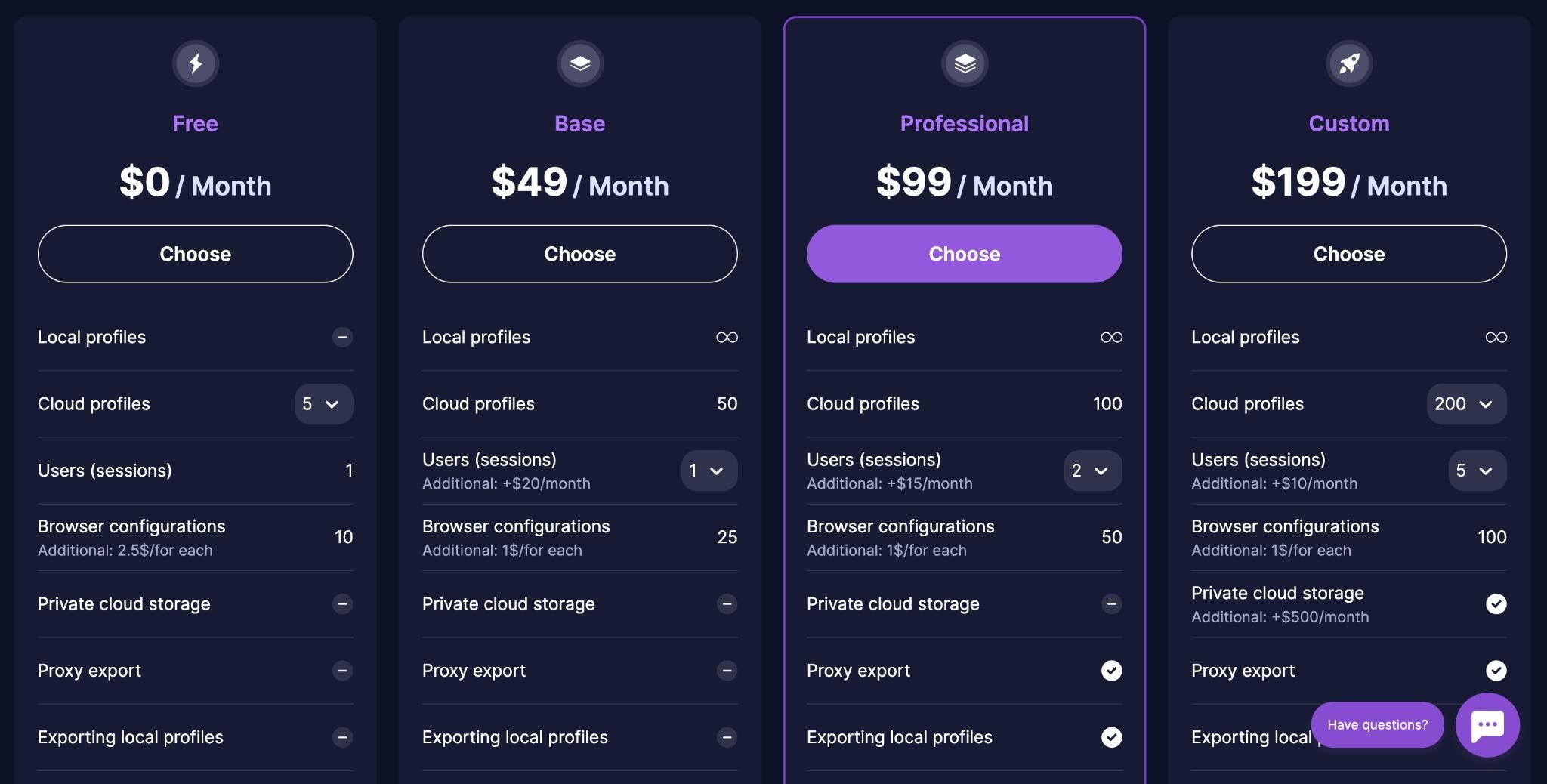 访问配置存储:所有计划都提供对配置存储的访问,这允许额外购买浏览器指纹。 每周提供两次免费配置更新。