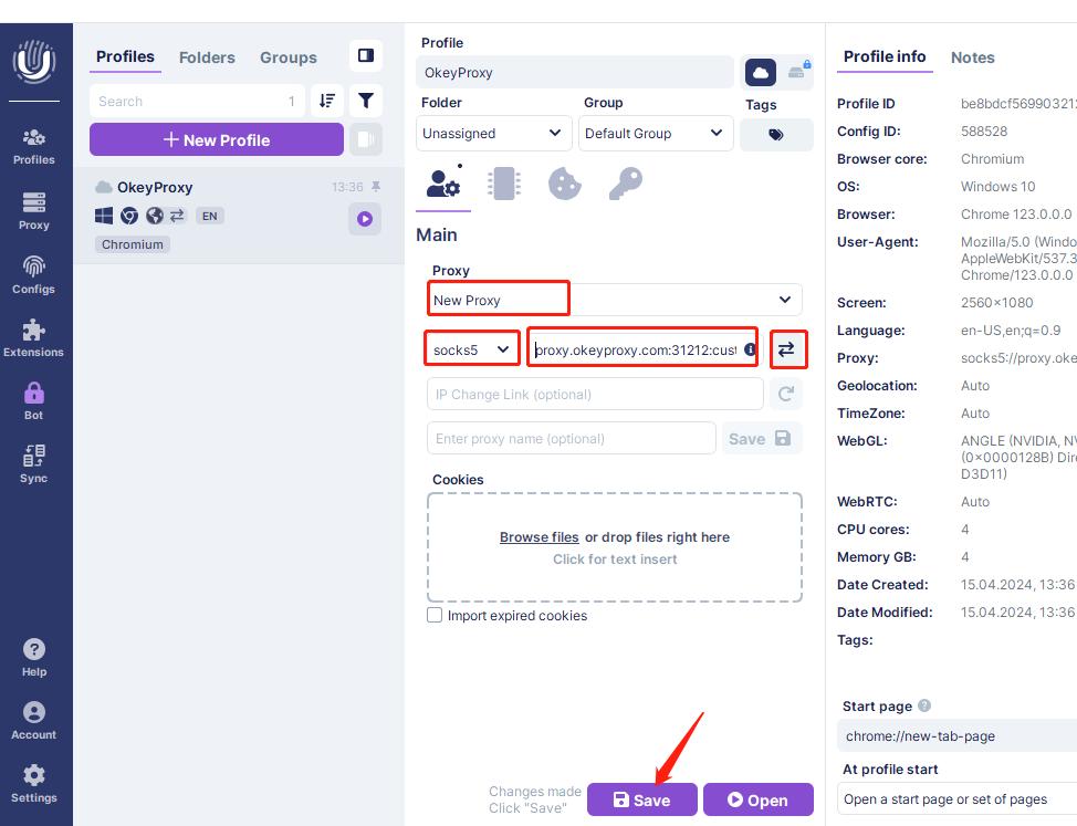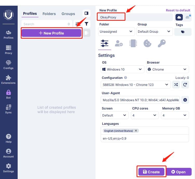 OkeyProxy 提供 1.5 亿个真实住宅 IP,跨越 200 个或更多国家。 作为首要的 SOCKS5 代理提供商,OkeyProxy 与所有设备和使用场景无缝集成,增强了 UnDetectable.io 的性能和功能。1.下载 UnDetectable AntiDetect Browser 并登录。点击“新个人资料”。