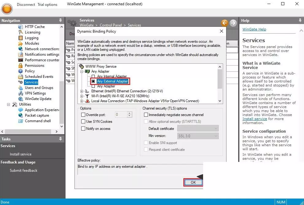 服务属性窗口将出现。导航至绑定选项卡。移除所有活动绑定,然后单击 "添加"。选择 "任何外部适配器",然后单击 "确定 "保存配置。